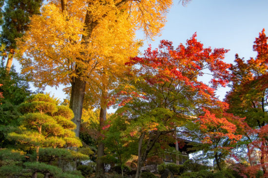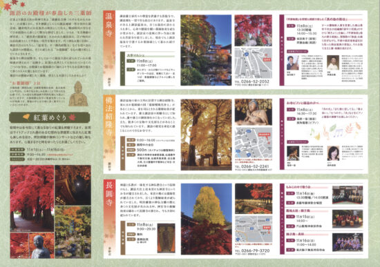 佛法紹隆寺では、高さ40mの天然記念物・夫婦イチョウの葉が黄色く色づき、温泉寺では、樹齢約370年の枝垂れ桜をはじめ庭園の木々が赤や橙に。そして長円寺では、楓の木が真っ赤に染まり、参道一面が鮮やかな赤色に彩られます。