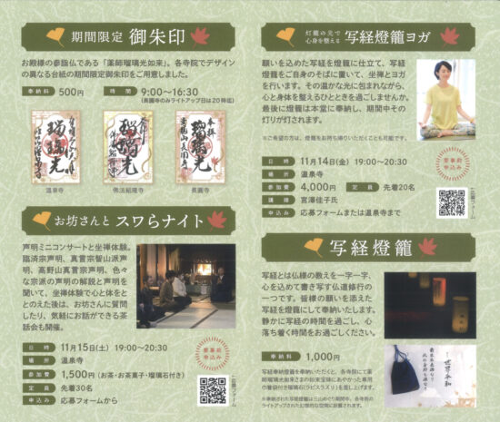 また、期間中にはイベントを盛り上げるさまざまな企画も用意されています。特別拝観や期間限定の御朱印販売、坐禅体験や声明ミニコンサートを行う「お坊さんとスワらナイト」、写経燈籠をそばに置いて燈籠の光に包まれながら行う「写経燈籠ヨガ」、ピアノと篠笛の夕べ、琵琶と朗読で楽しむ『平家物語』など、予約が必要なのものから気軽に参加できるものまでいろいろと楽しめるので、ぜひチェックしてみてください。