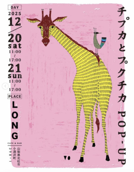 そんなLONG小淵沢にて、12月20日と21日の2日間にわたり、「チプカとプクチカ POPUP」が開催! LONGのロゴやメニューにも登場する、印象的なキリンのデザインを担当したデザインユニット「チプカとプクチカ」さんのポップアップとなっています。