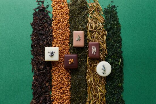 日本各地で生産されるお茶をセレクトした「茶(ちゃ)。静岡県・カネロク松本園の烏龍茶、三重・伊勢宇治園の伊勢茶、京都・柳櫻園の玄米茶、石川・丸八製茶場の加賀棒茶、愛知の西尾抹茶を厳選し、自家製チョコレートをそれぞれのお茶に合わせてブレンドしたコレクションです。