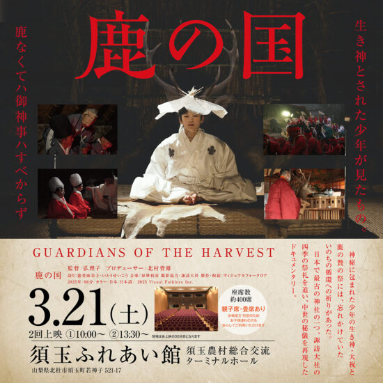 3月21日、北杜市須玉ふれあい館にて、映画『鹿の国』が上映会が開催されます。『鹿の国』は、信州・諏訪盆地を舞台に、日本最古の神社のひとつと言われる諏訪大社の祭礼を追ったドキュメンタリー映画。2024年1月に公開以降、ドキュメンタリー映画として異例の大ヒットを記録しました。