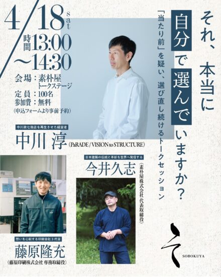 今回のテーマは「それ、本当に自分で選んでいますか?」。「当たり前」を疑い、選び直し続けるトークセッションとして、長野県松本市の印刷会社・藤原印刷から藤原隆充さんをファシリテーターに、中川政七商店の先代・中川 淳さんをゲストに迎え行われます。